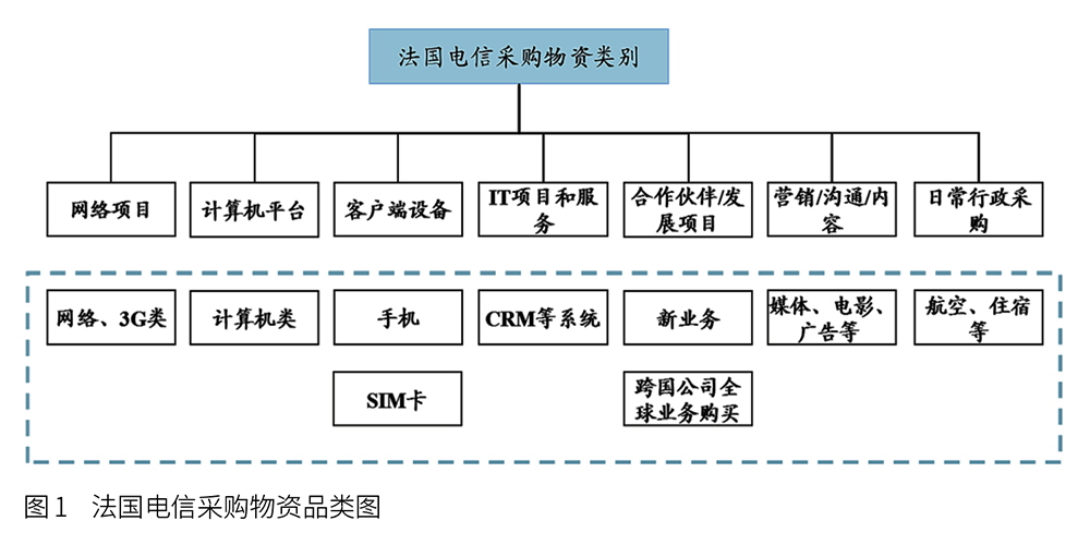 國際運營商通常以產(chǎn)品特性為出發(fā)點,根據(jù)供應(yīng)商基礎(chǔ)及產(chǎn)品流程維度等進行類的劃分。如法國電信將采購物資劃分為七大領(lǐng)域共80多類(見圖1)。
