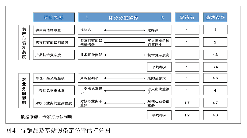 構(gòu)建評估打分表,從上述兩個維度量化供應(yīng)市場復(fù)雜度和業(yè)務(wù)影響度。以促銷品和基站設(shè)備為例,分析市場復(fù)雜度和對業(yè)務(wù)影響度,評價結(jié)果如圖4所示。