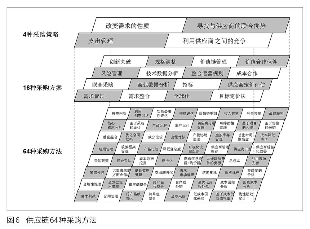 通過供方和需求方的力量對比,判斷基本的采購策略,根據(jù)采購策略中的基本策略對應(yīng)16種采購方案以及64種采購方法,如圖6所示。