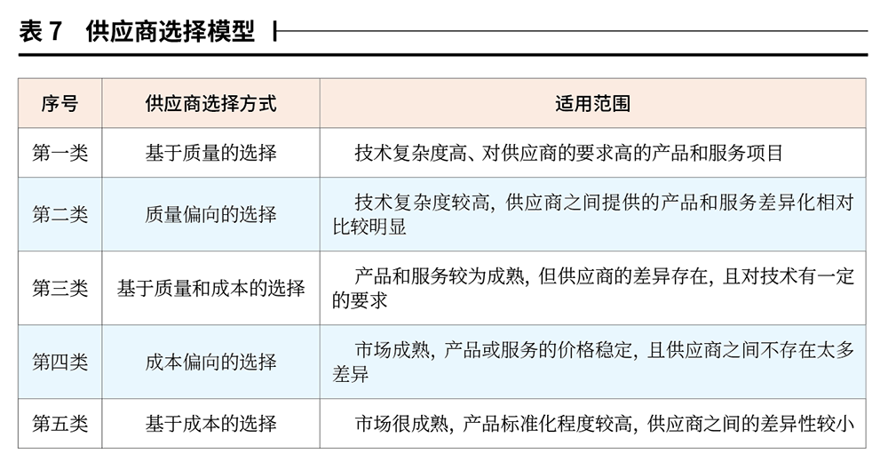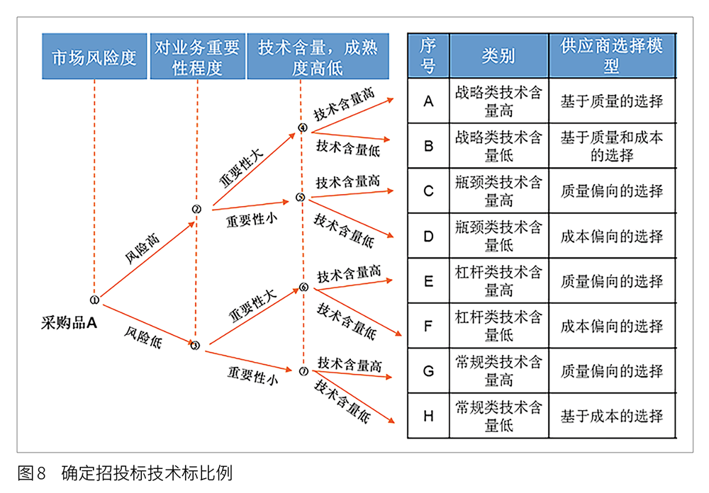 在確定了技術(shù)標(biāo)占比和供應(yīng)商選擇模型后,依據(jù)表8所示的供應(yīng)商選擇評標(biāo)標(biāo)準(zhǔn)對不同的采購物資進行分類,確定供應(yīng)商選擇方式。